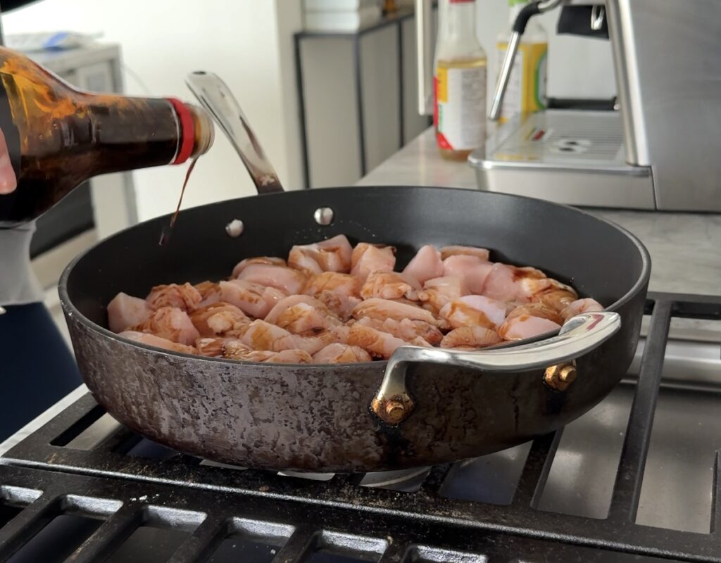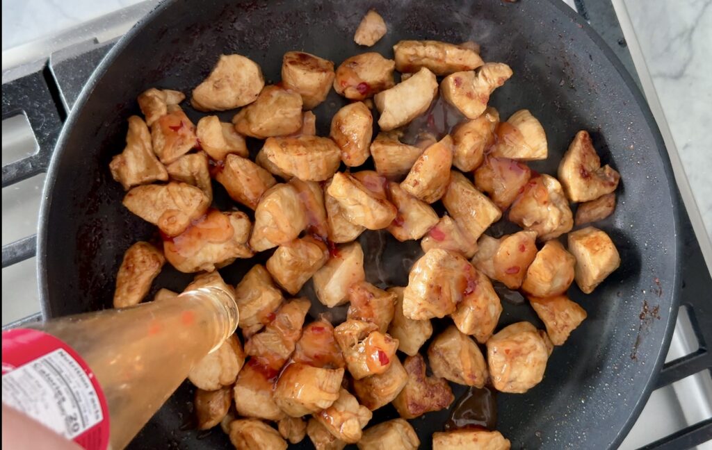 Heat olive oil in a large skillet over medium heat. Add your chicken to the pan and sauté for about a minute before pouring in the soy sauce, mirin, and rice vinegar. Stir to coat all the pieces evenly. Cook the chicken for about 8 minutes, turning occasionally, until it’s golden brown and fully cooked through.