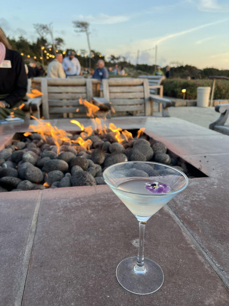 We boarded the resort shuttle from Spanish Bay to the Pebble Beach golf course, where we were greeted by a putting competition and wall of culinary syringes filled with tropical vodka shots (okay, cool). We sat at a fire pit overlooking the golf course and enjoyed bottomless cocktails – I was on a skinny margarita kick after having out-wine’d and out-martini’d myself the prior nights. And once again, there were buffets set up everywhere.