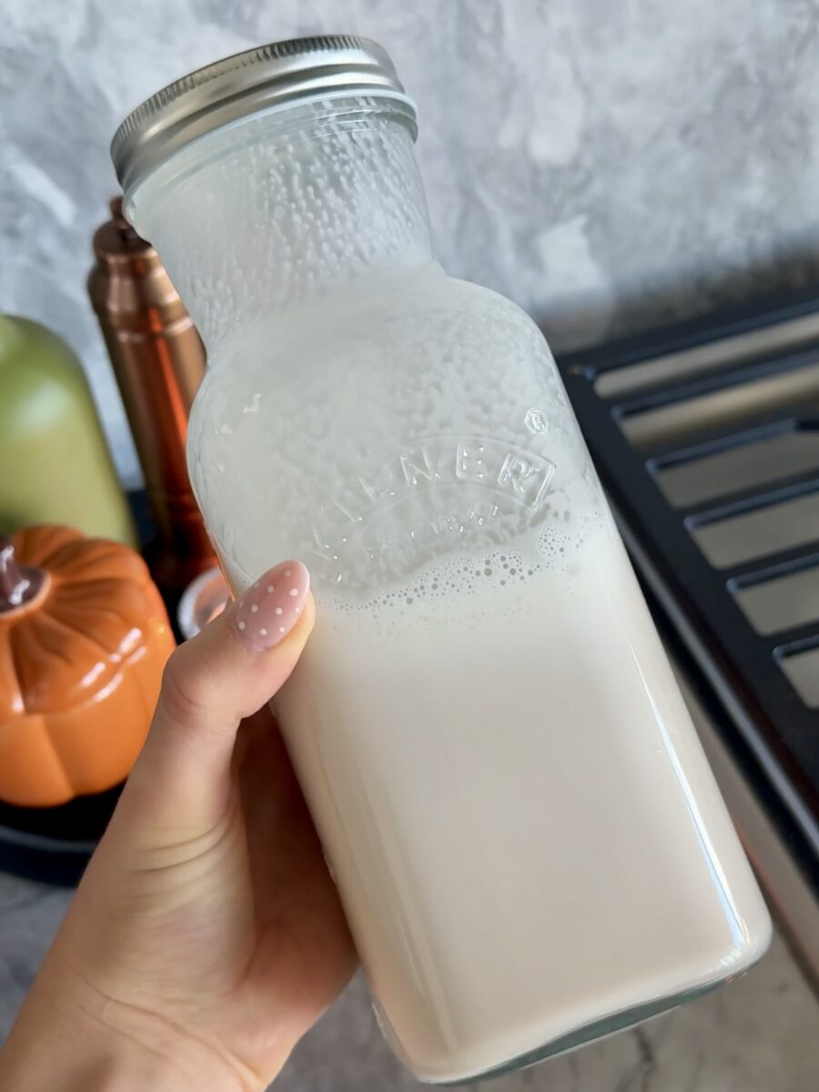 I love making this pumpkin spice almond milk during the fall season because it’s warm flavors add a hint of coziness to whatever drink you’re using it for!