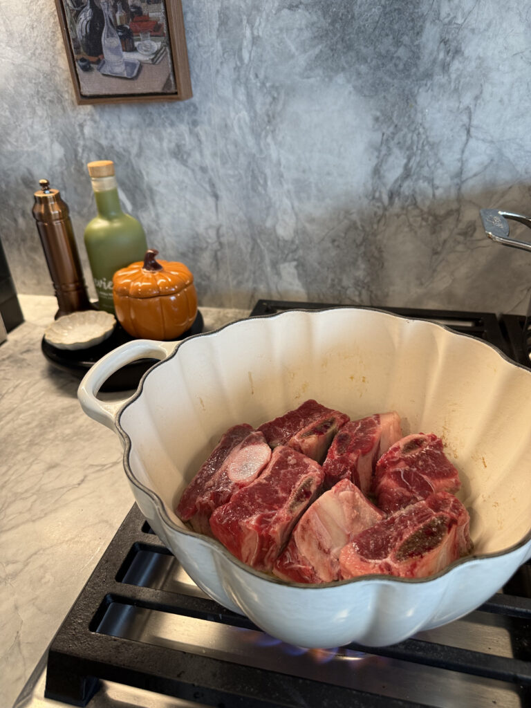 8. Once ready, remove the pot from the oven and transfer the short ribs to a separate plate using tongs